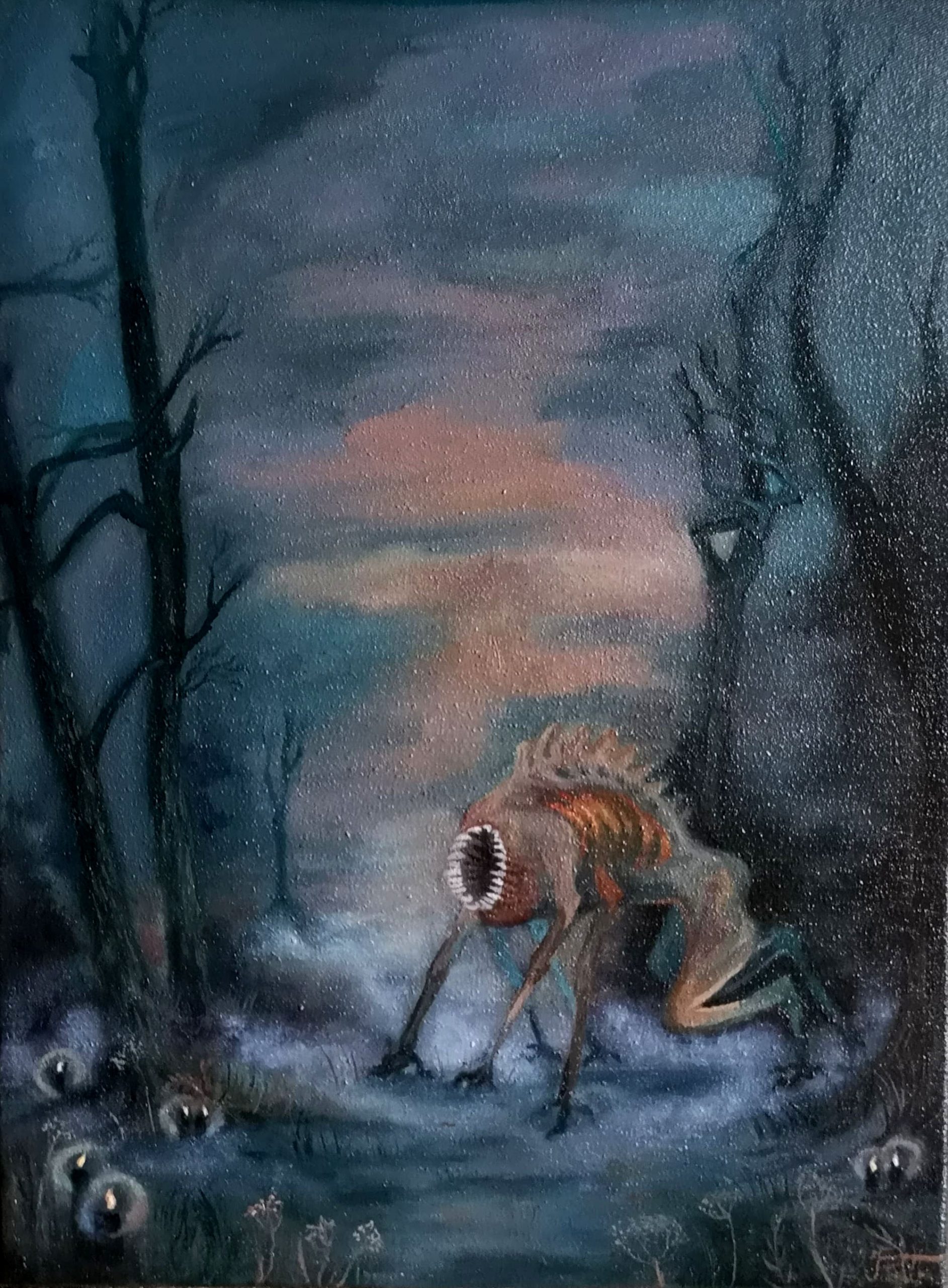 Die Figur Agnes durchstreift einsam einen nebligen Wald.