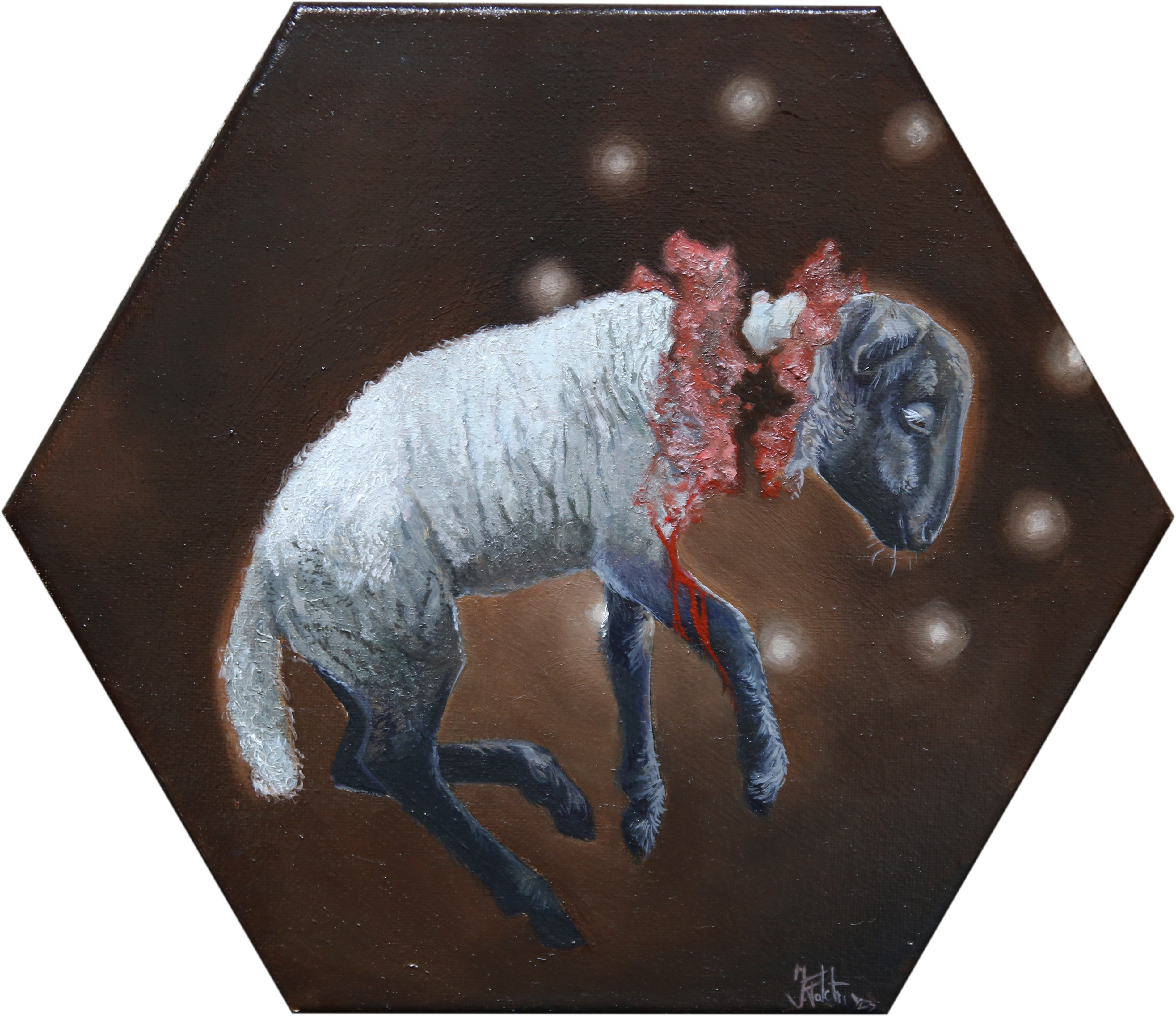 Ikonisches Gemälde von einem geköpften Lamm, leichtes Impasto.