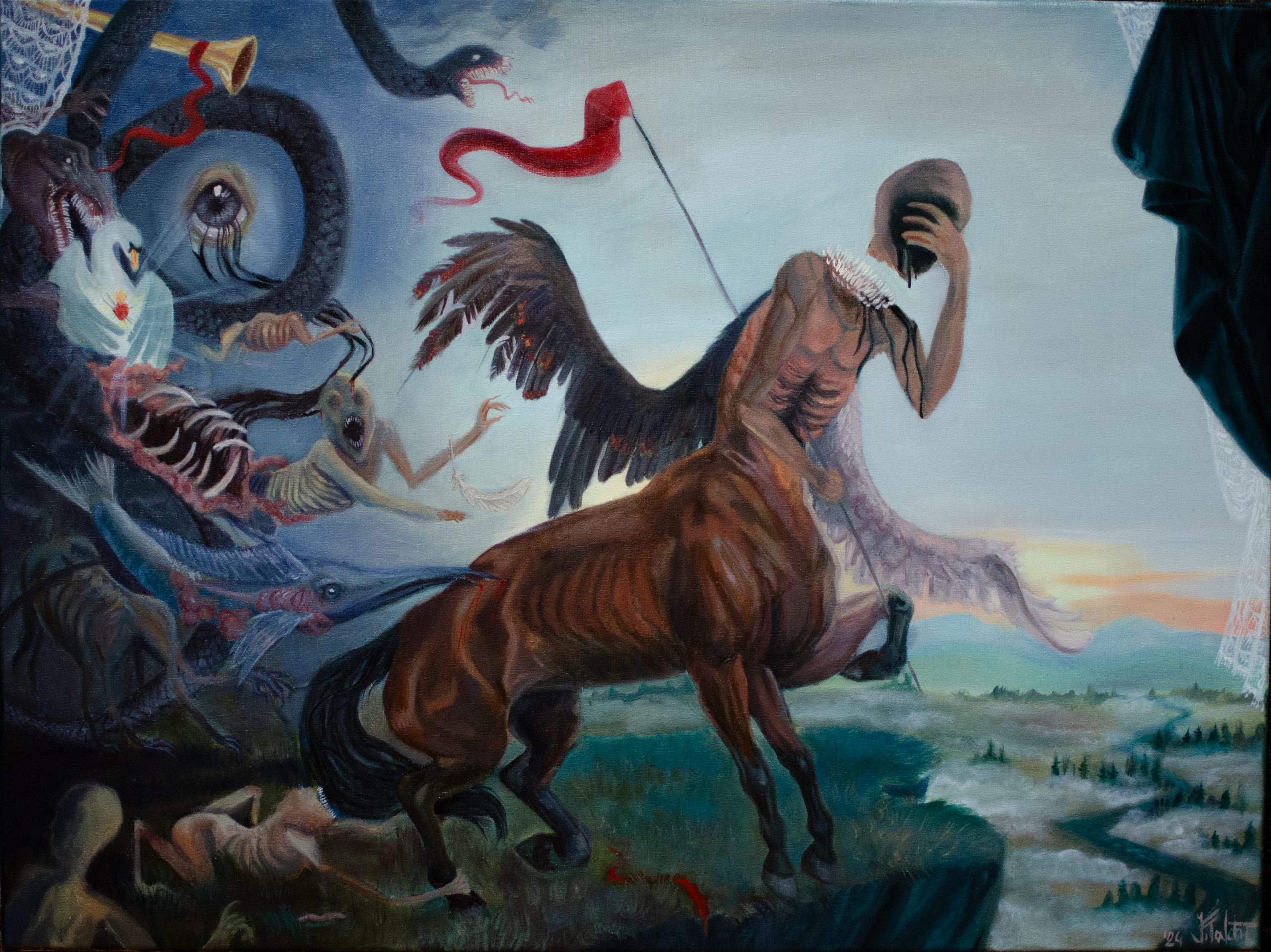 Ein Gemälde aus der Reihe ‚Abyss‘. Gedankengänge auf die Leinwand gebannt; ein gejagtes Wesen am Abgrund. Errettung oder Hetzjagd an einem Unschuldigen?