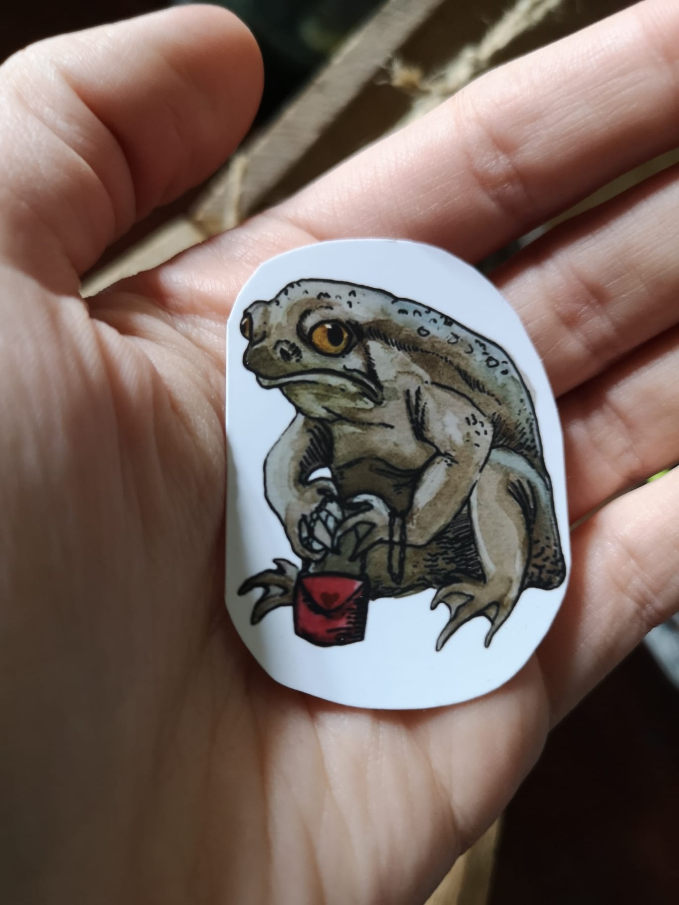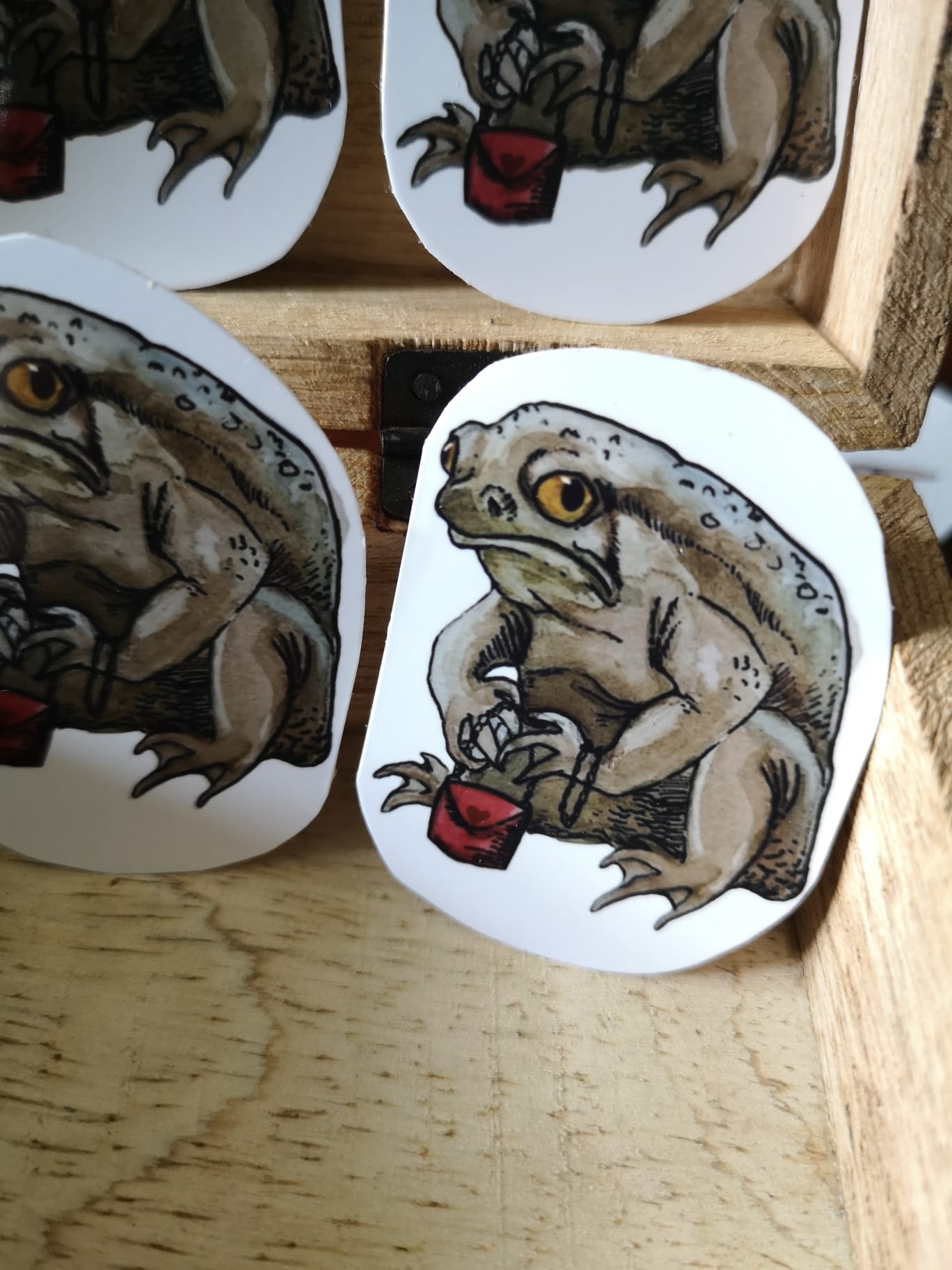 Dieser Sticker von einer bockigen Kröte – ‚Grumpy Toad‘ – ziert jedes Notizbuch, jeden Kalender o.ä.