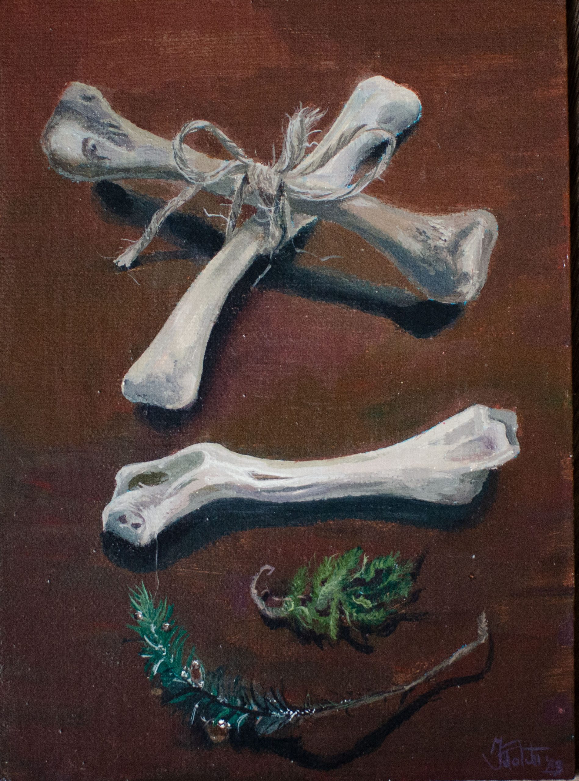 Ein ruhiges, stimmungsvolles Stillleben von dynamisch arrangierten Knochen und etwas Moos auf dunklem Grund. An der Rückseite ist ein Aufhänger befestigt, sodass das Gemälde direkt aufgehängt werden kann.