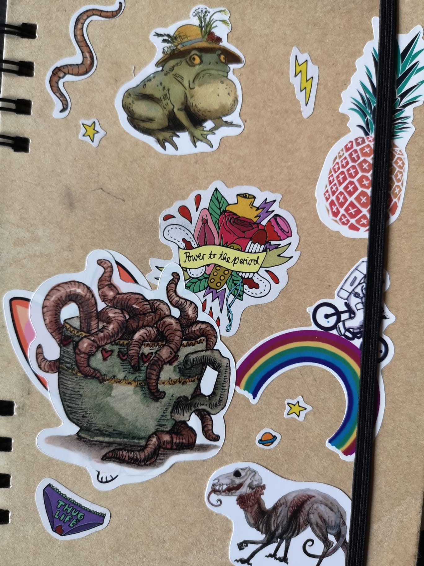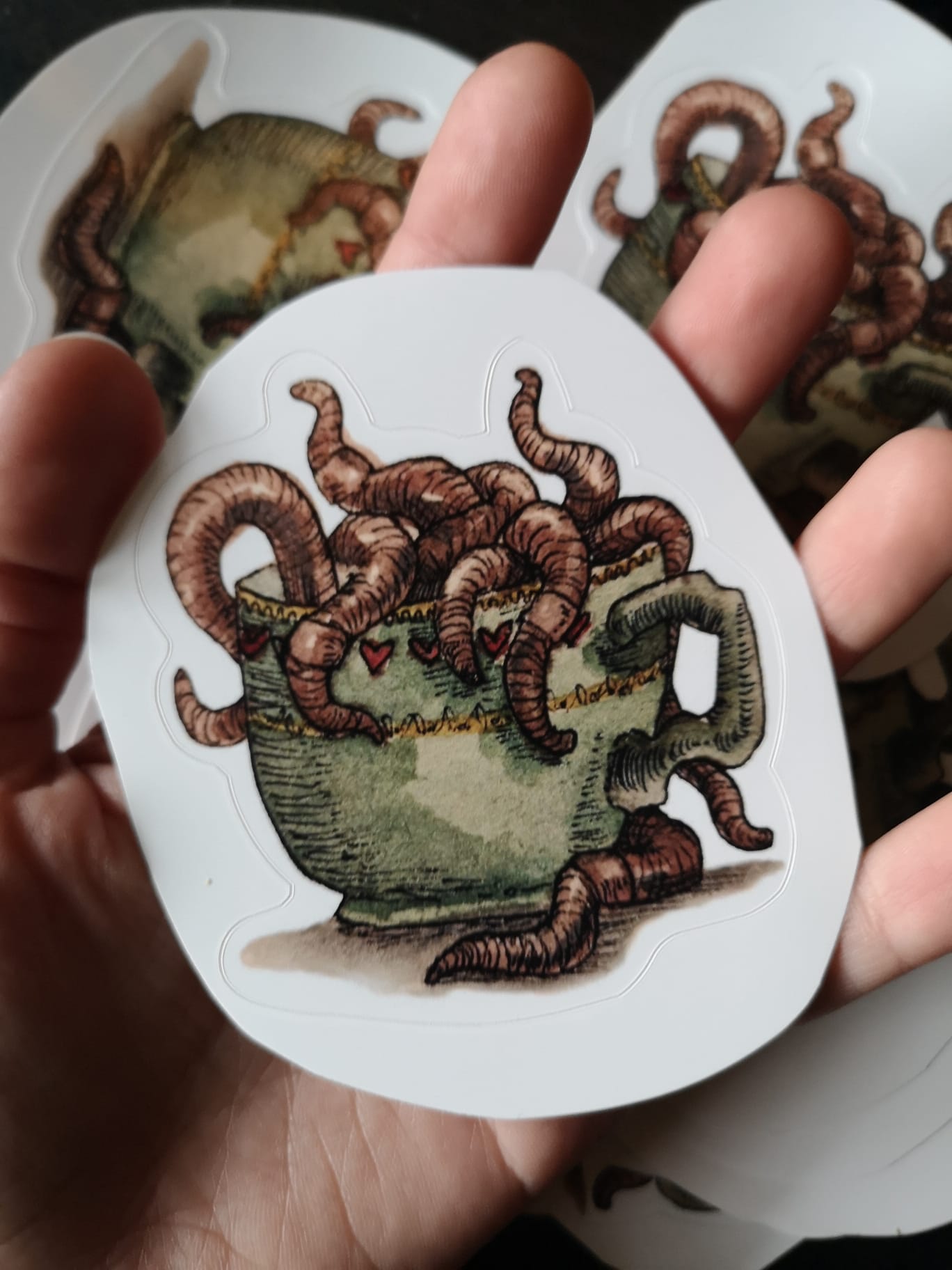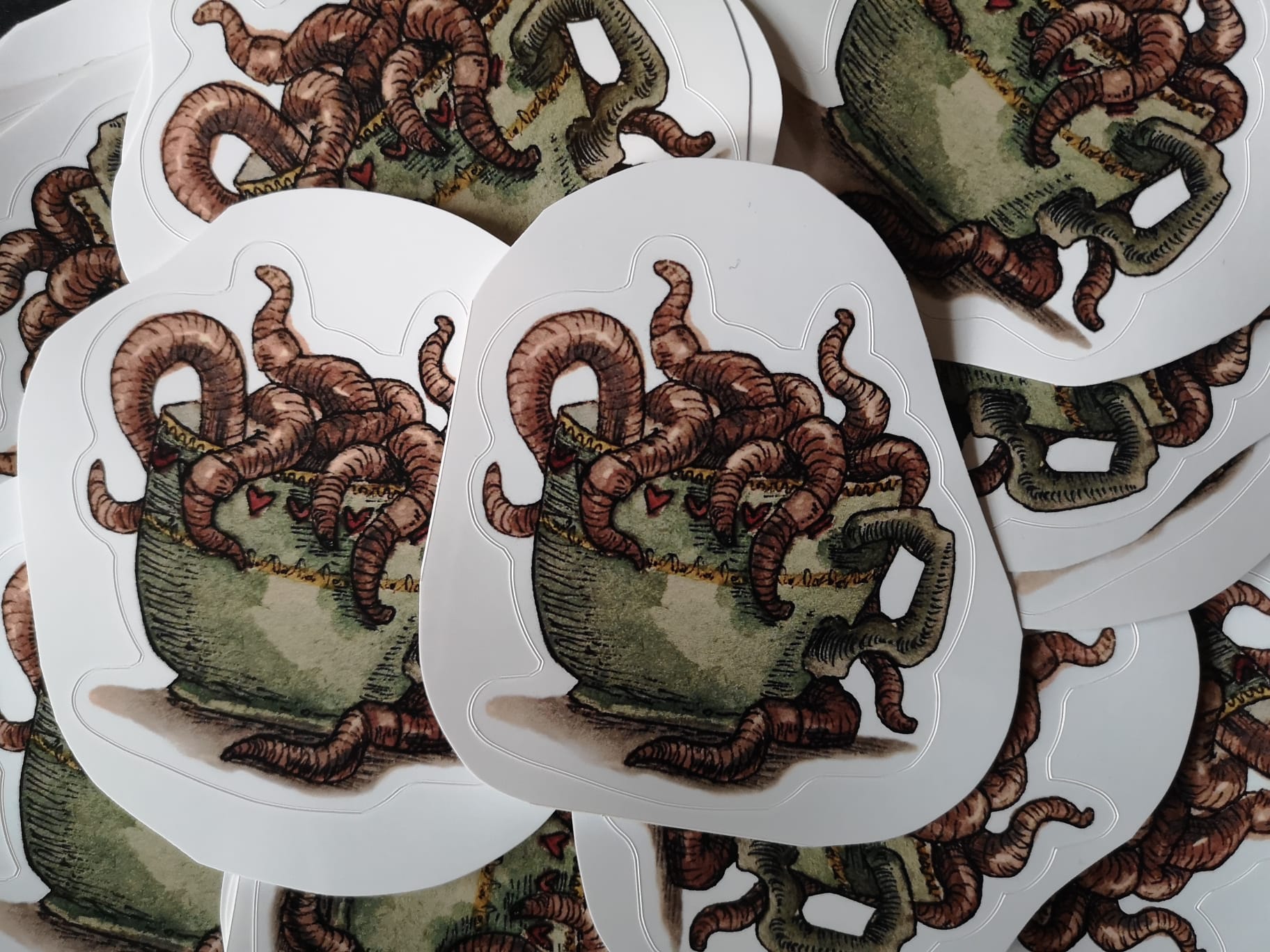 Eine Tasse voll mit Regenwürmern – ein ganzer, kleiner Mikrokosmos in einer Tasse. Fast wie ein Mini-Parlament. Die Sticker basieren auf einer handgemalten Aquarellzeichnung, diese wurde eingescannt und digitalisiert.